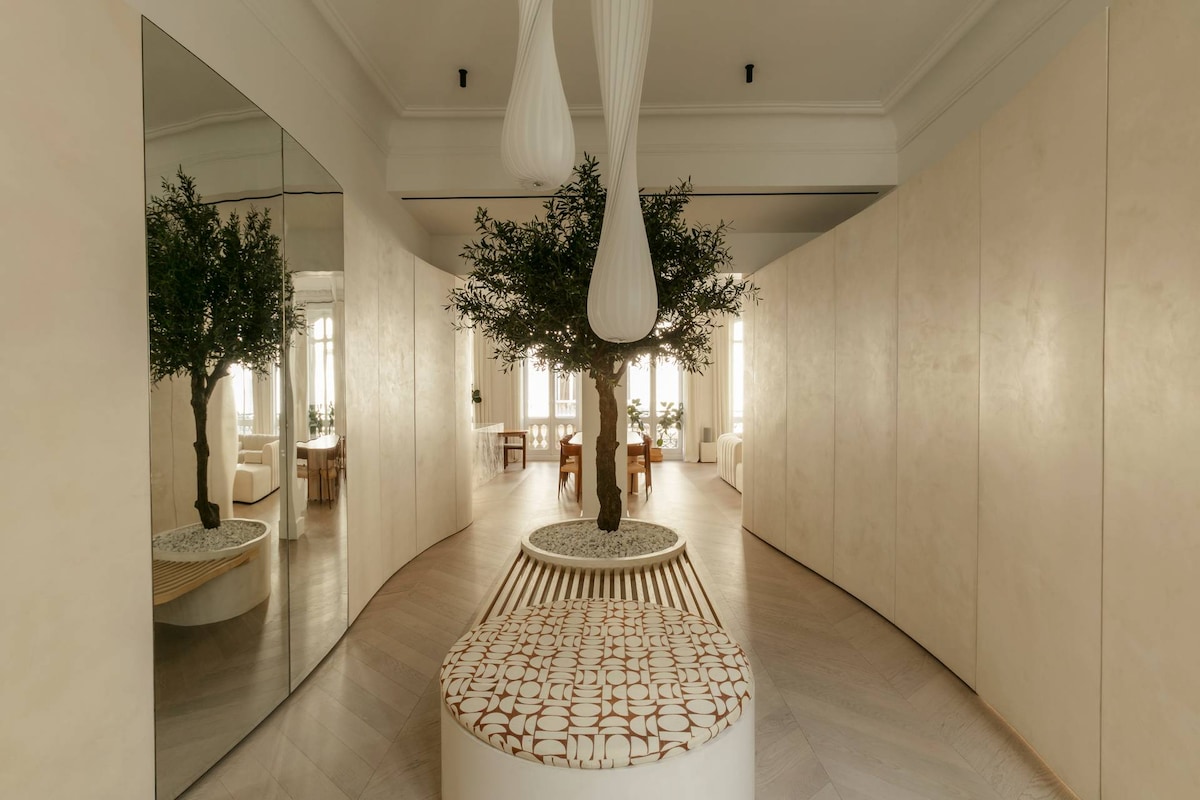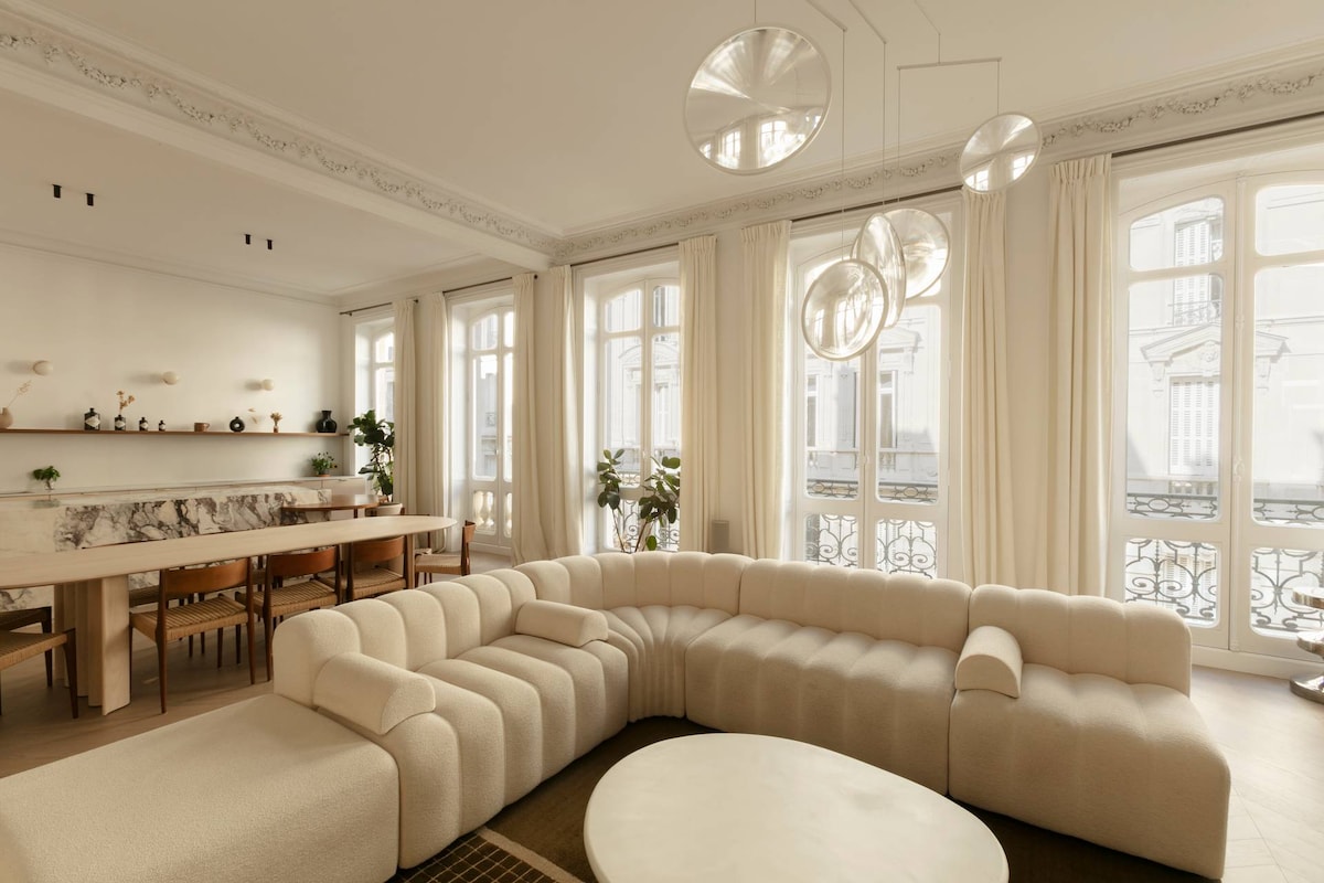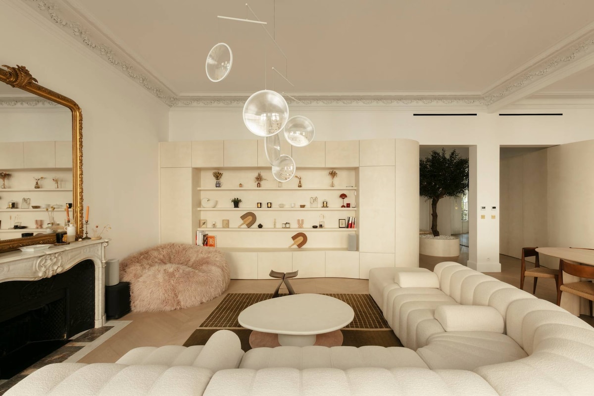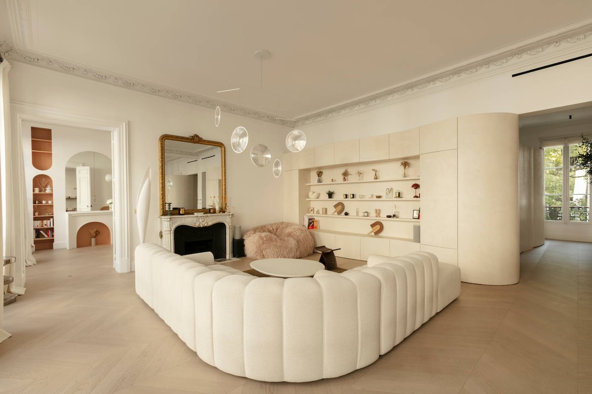 Included amenities: Wifi, Welcome Pack, Toiletries, Area Tips, Cleaning, Fridge Fill Service, Cafetiere, 24/7 Support. The space Sitting in the elegant 9th Arrondissement with a Métro station nearby, Rue d'Aumale offers serene, minimalist accommodation for up to six guests. Immerse yourself in Parisian life with a wealth of cultural attractions, an exquisite fine-dining scene and the heady scent of bakeries and cafés on your doorstep. Close to the glamourous Boulevard Haussmann, you'll find the grand Palais Garnier and high-end shopping opportunities in the department stores. For the culture lovers of your group, the Théâtre Saint-Georges and Gustave Moreau Museum are just a short stroll from your front door. Iconic attractions such as the Eiffel Tower and the Arc de Triomphe are within easy reach by car or Métro. Curated by a serene yet opulent Japandi interior style designed by the renowned Parisian architect studio Heju, the light-filled rooms are calm and soothing. An airy living room features a period fireplace and a sumptuous white sectional sofa to snuggle up in front of a movie on the home cinema projector. An exceptionally chic modern kitchen with a striking marble island, gold accents, and a curved wooden breakfast bar will inspire you to rustle up delicious French delights to enjoy at the classic dining table. Find three sublimely peaceful ensuite bedrooms with a soft nude and peachy colourway. The primary bedroom features a super-king bed, a cosy seating area and a dressing room augmented by a divine spa-style ensuite, complete with a soaking tub. The second minimalist-style bedroom has a king-size bed and an ensuite with a waterfall shower. The final ensuite bedroom features a king-size bed, a sweet cot for your little one, and a useful desk nook, should you need to connect with work. Few Paris vacation rentals offer such a sophisticated, contemporary base for exploring the 9th Arrondissement and beyond as the tranquil Rue d'Aumale. Home Truths: - This home accepts babies and children toddlers and pets. This home is on the second floors with an external elevator. This home has air conditioning throughout. Please be aware that european air conditioning units are designed for a milder temperature range than american units. Whilst there is air conditioning in this home it might not feel as cool as some american air conditioning units. You can access to the second bedroom from the master bedroom. This home has hidden doors to access to the master and third bedrooms. Since the photoshoot the homeowner has replaced the cot in the third bedroom with a queen size bed. One loveable dog and a cat lives at this home. They won't be around during your stay, but this home may not be suitable for people with allergies. There are no photographs available for the toilets. Long term stay discounts are not applicable to this home. There is a television in the master bedroom only. - This is a private home with some personal touches. - Please note this property requires full payment for the stay prior to check-in, guests will receive a message from the property with a secure payment link after booking. The lead guest must be at least 25 years old, we will check the lead guest’s I.D. and secure a 1,000€ hold on a credit or debit card which will be released once we confirm no damage was caused during your stay. Registration Details 7510909803766